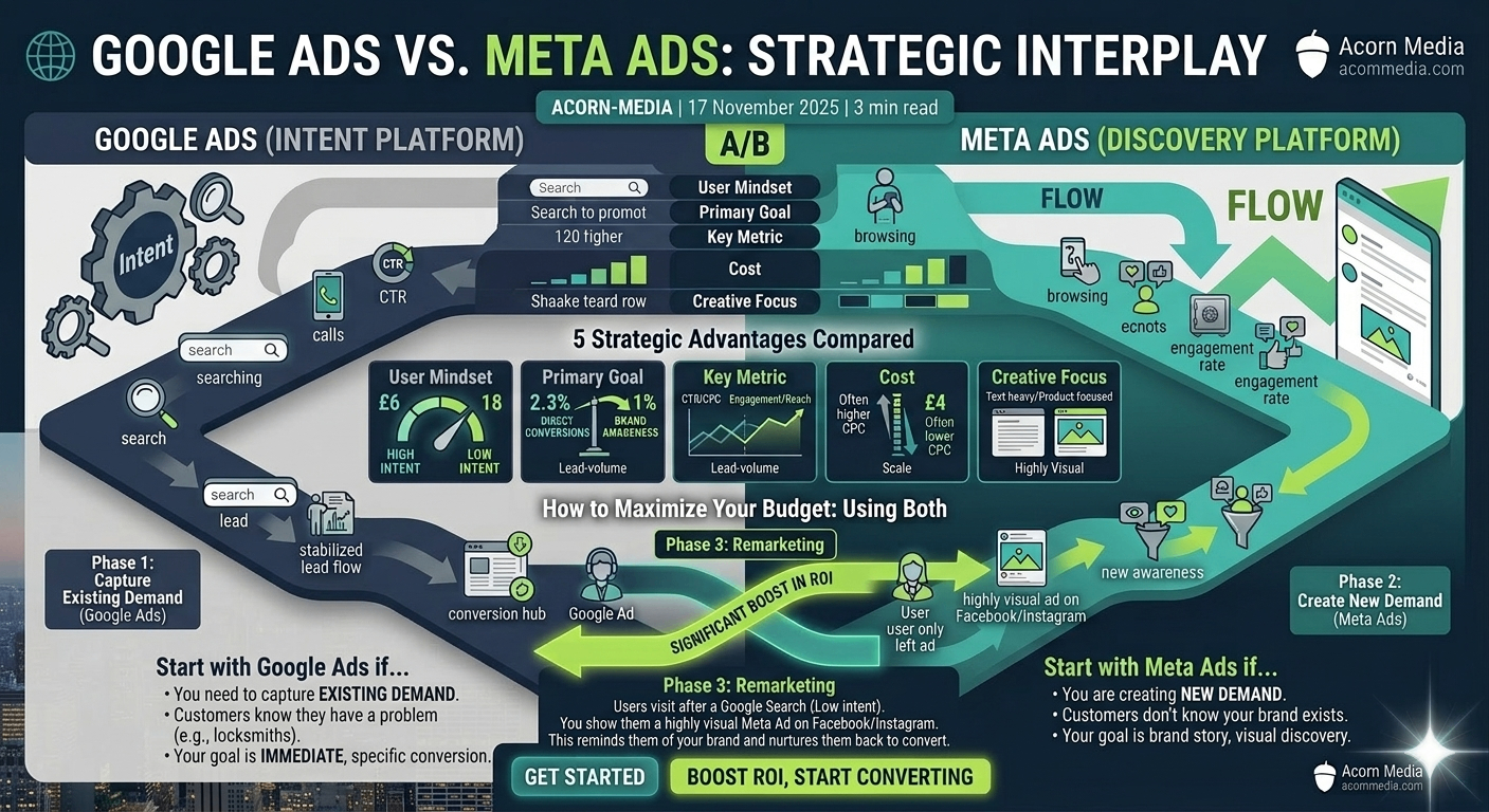 When a business decides to invest in paid advertising, they almost immediately face the fundamental choice: Google Ads or Meta Ads (Facebook and Instagram).
